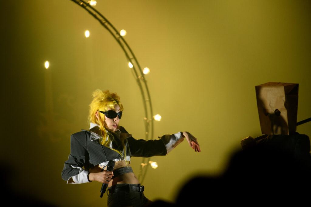 De AB Box was maar schamel gevuld, wat gezien de productie van deze show echt niet te verklaren valt. Dorian Electra bracht voor “Puppet” bijvoorbeeld een gigantische pop op podium voor een levensecht marionettenspel of liet hun in “Yes Man” zelfs onthoofden, wat voor verbaasde gezichten zorgde. Qua showgehalte kon Dorian Electra met gemak een Lady Gaga evenaren, waarvoor die in het verleden al een remix maakte en in het rustpunt van de show zelfs duidelijk de mosterd haalde bij mother monster. “Carreer Boy” en het begin van “Man To Man” werden namelijk in pianoversies gebracht, die veel weg hadden van hoe de “Poker Face”-zangeres zelf achter de piano kruipt. Dat betekent echter niet dat Dorian Electra een saaie copycat is. In tegendeel, hun show was voor ons namelijk de eerste popshow in lange tijd die de innovatie evenaarde van een Lady Gaga-show.