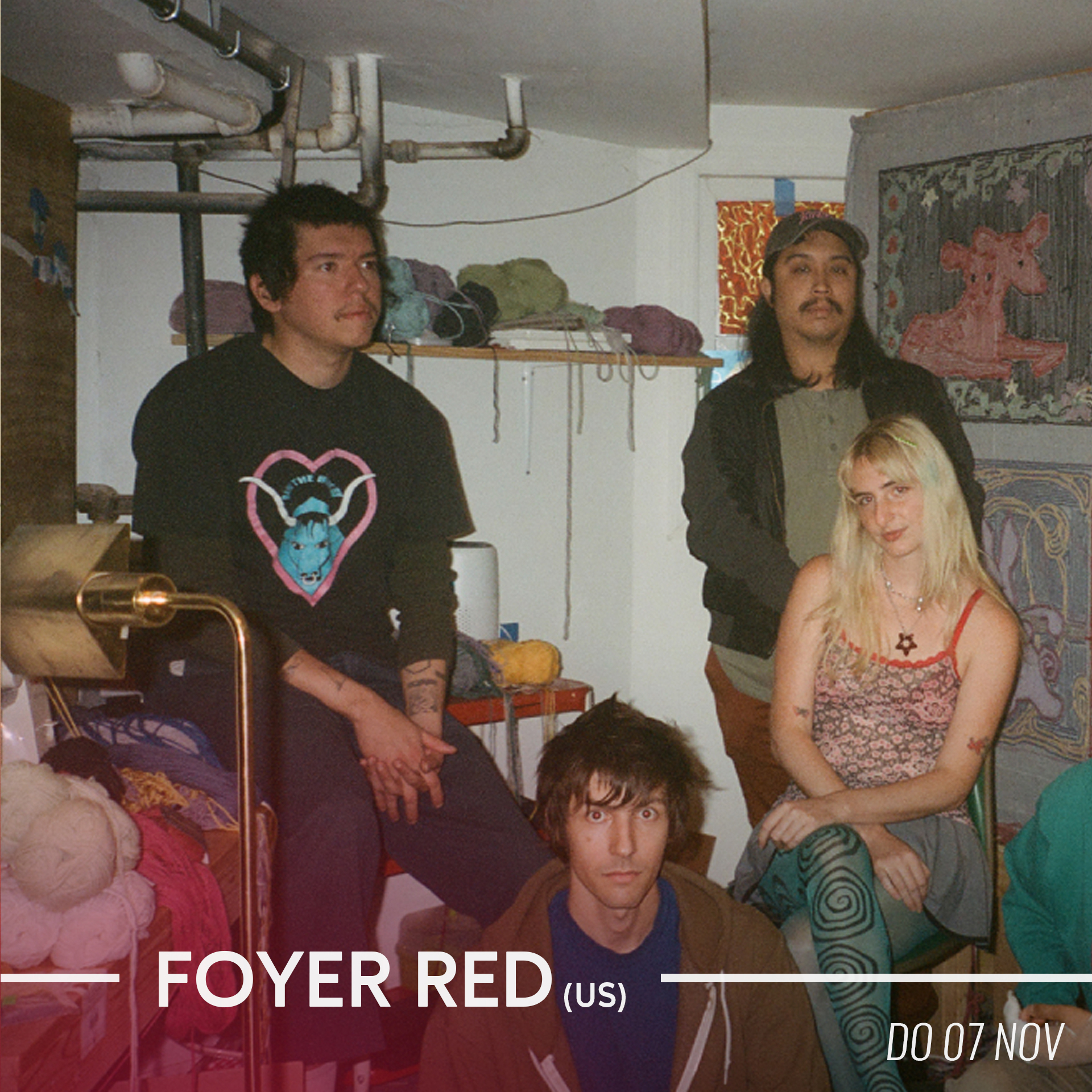 De maand beginnen doen we meteen met een band die de Grote Plas moet oversteken: Foyer Red uit Brooklyn. En dan weet je eigenlijk al meteen dat het goed is. Verwacht je aan gezellige chaos, poprock met een hoek af, of misschien wel net aan het onverwachte. Het vijftal wist in zijn nog relatief korte bestaan al indruk te maken op gerenommeerde magazines als Pitchfork, Rolling Stone en Stereogum, waarbij die laatste de groep zelfs vergeleek met Pinegrove. Het belooft met andere woorden al een interessante avond te worden. Te ontdekken op donderdag 7 november!
